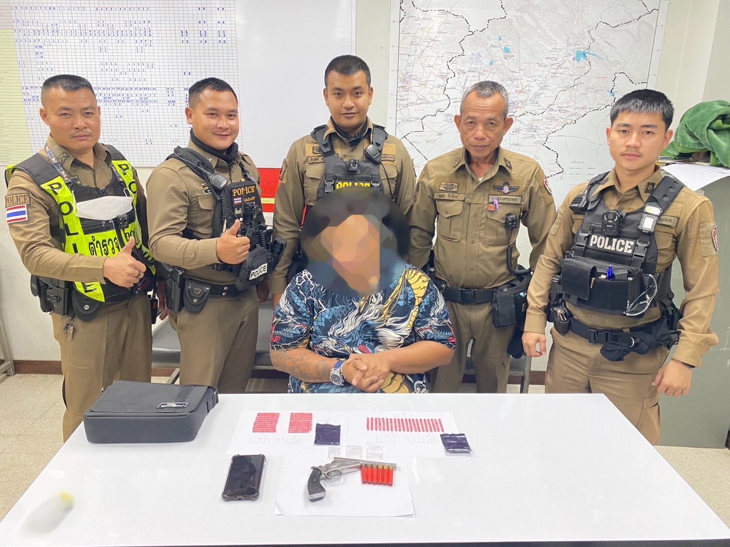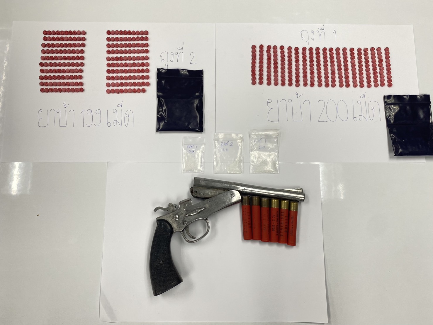 ในการปฏิบัติงานครั้งนี้ เจ้าหน้าที่สามารถจับกุมผู้ต้องหาชายอายุ 32 ปี ครอบครองอาวุธปืนเถื่อน, พกพาอาวุธปืนโดยไม่ได้รับอนุญาต, ครอบครองยาเสพติดประเภท ยาบ้า เพื่อจำหน่าย, และขับรถขณะเสพยาเสพติด