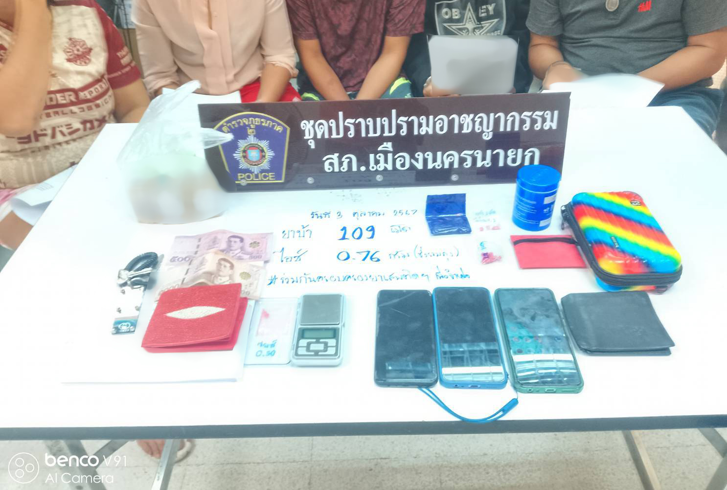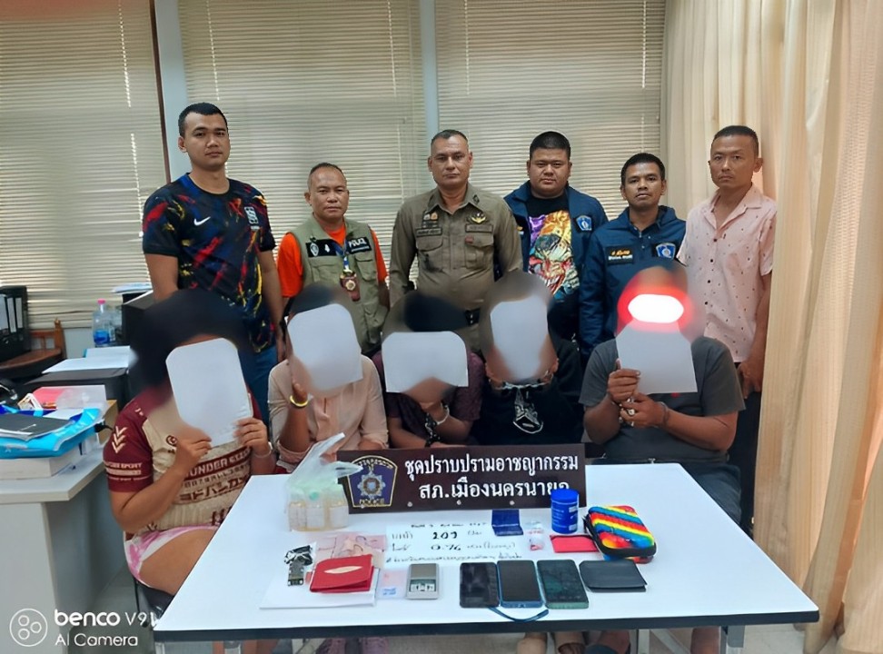 ตำรวจ สภ.เมืองนครนายก บุกจับกุมกลุ่มมั่วสุมเสพยา 5 ราย พร้อมของกลางยาบ้า 109 เม็ด
