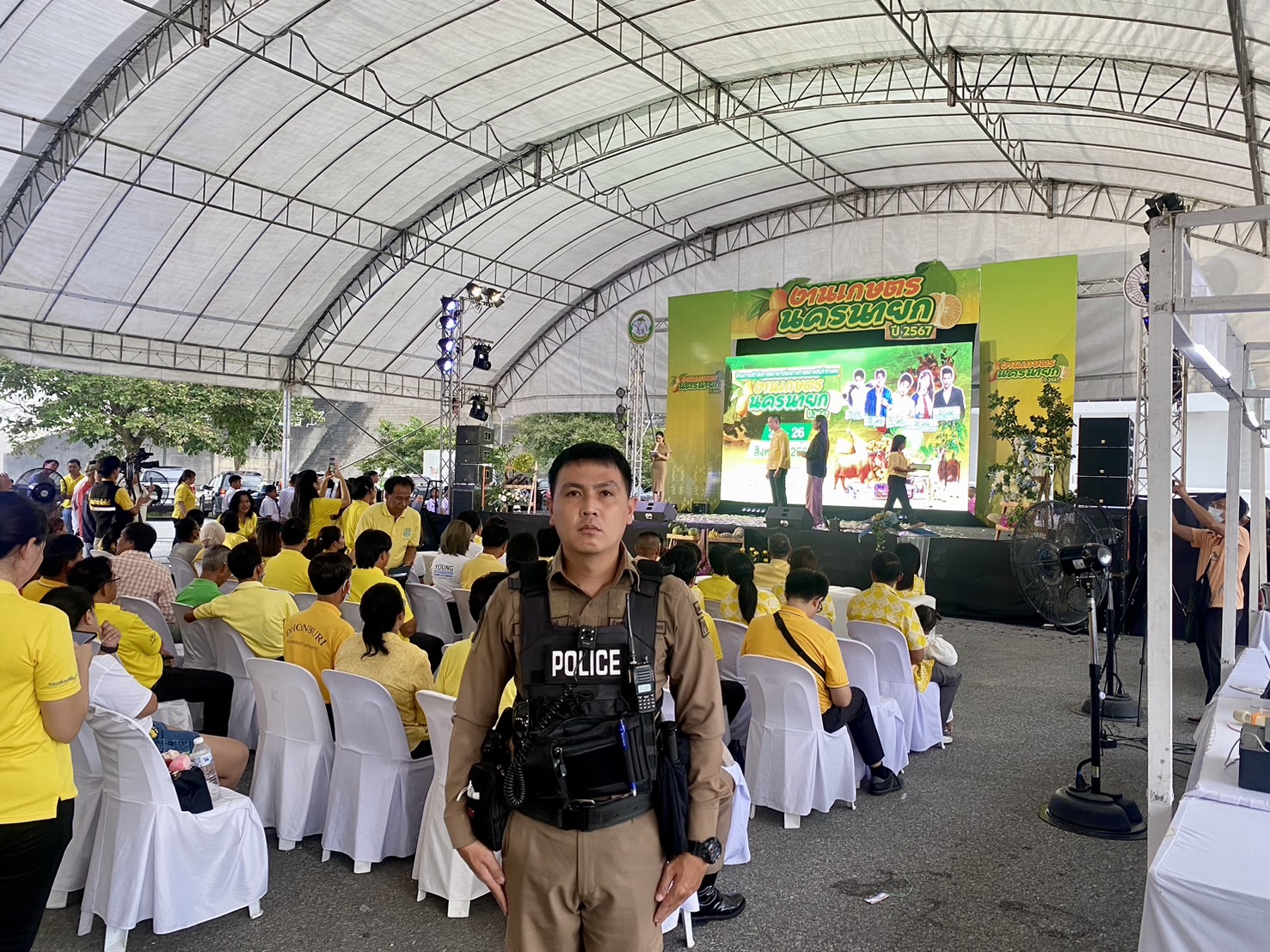 พันตำรวจตรี วีรศักดิ์ บาลโสง พร้อมกำลังพลตำรวจ สายตรวจตำบลหินตั้ง ร่วมงานเกษตรจังหวัดนครนายก ณ เขื่อนขุนด่านปราการชล เมื่อวันที่ 24 สิงหาคม 2567 โดยได้ร่วมกิจกรรมต่างๆ มากมาย อาทิ การเยี่ยมชมผลผลิตทางการเกษตร สินค้าแปลรูป และร่วมกิจกรรมการประกวดผลผลิตทางการเกษตร นอกจากนี้ ยังได้ดูแลความปลอดภัยและอำนวยความสะดวกให้กับผู้เข้าร่วมงานทุกคนอีกด้วย