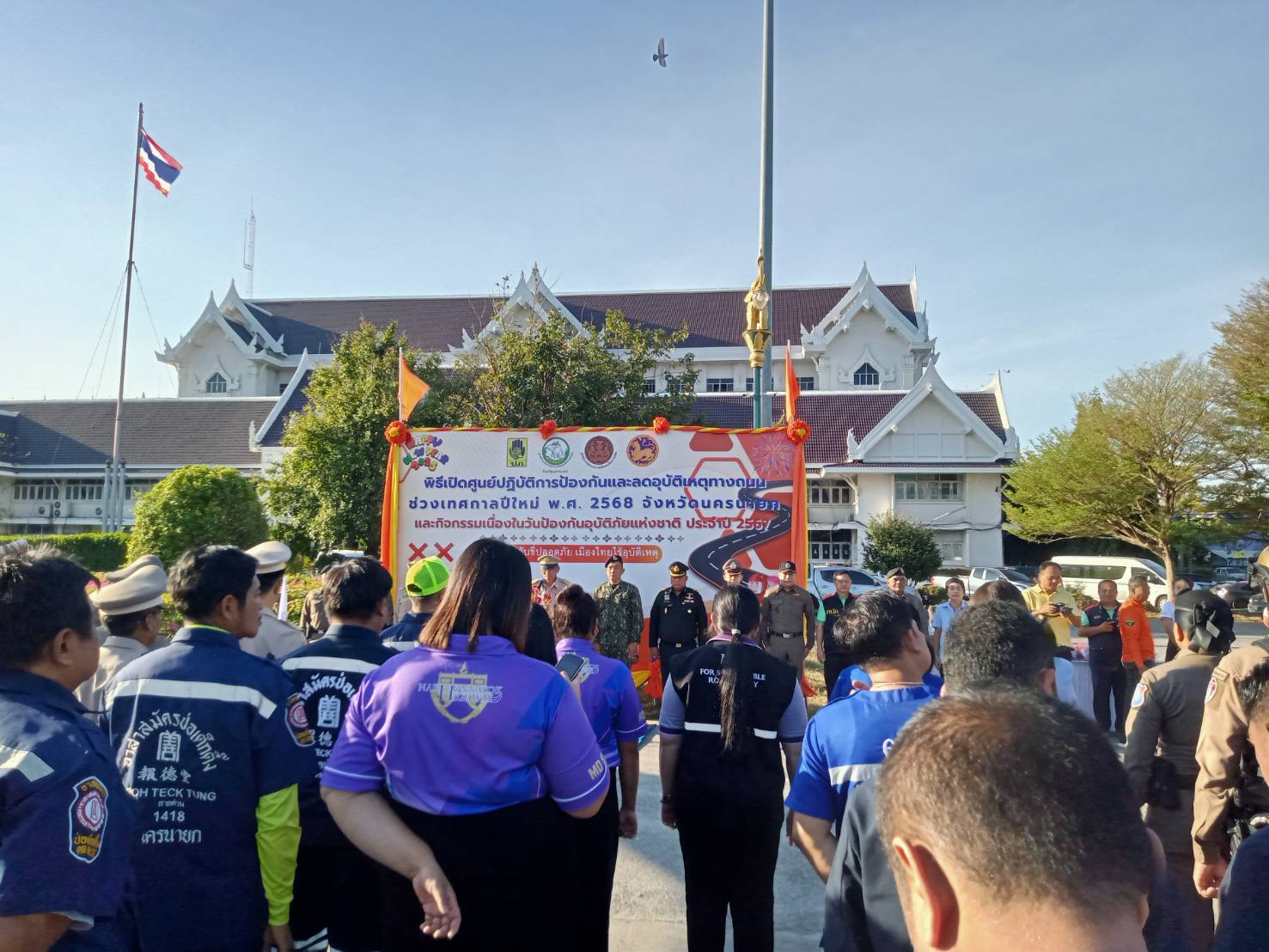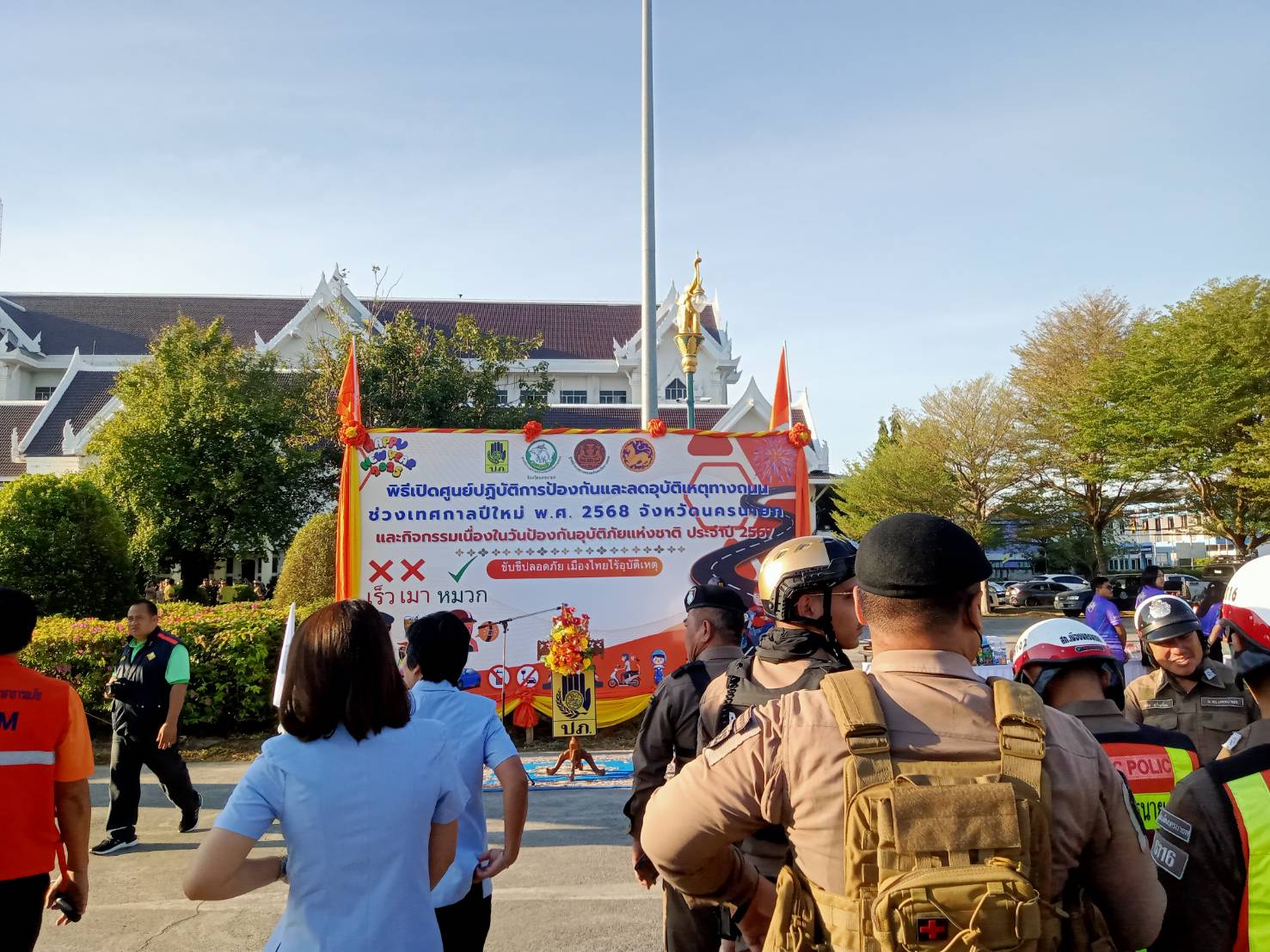 วันนี้ (25 ธันวาคม 2567) เวลา 08.00 น. ภายใต้การอำนวยการของ พ.ต.อ. สง่า ทางธรรม ผู้กำกับการสถานีตำรวจภูธรเมืองนครนายก (เมือง 1) และ พ.ต.ท. กิตตินันท์ ศรีม่วง รองผู้กำกับการป้องกันปราบปราม สภ.เมืองนครนายก (เมือง 2) ได้มอบหมายให้ พ.ต.ท. จรดล สร้างเอี่ยม สารวัตรจราจร สภ.เมืองนครนายก (เมือง 61) และ ร.ต.อ. นิธิกร ฉิมพาลี รองสารวัตรจราจร สภ.เมืองนครนายก (เมือง 60) พร้อมด้วยกำลังเจ้าหน้าที่จราจร เข้าร่วมกิจกรรมปิดศูนย์ปฏิบัติการป้องกันและลดอุบัติเหตุทางถนนช่วงเทศกาลปีใหม่ พ.ศ. 2568 ณ ลานกิจกรรมหน้าศาลากลางจังหวัดนครนายก