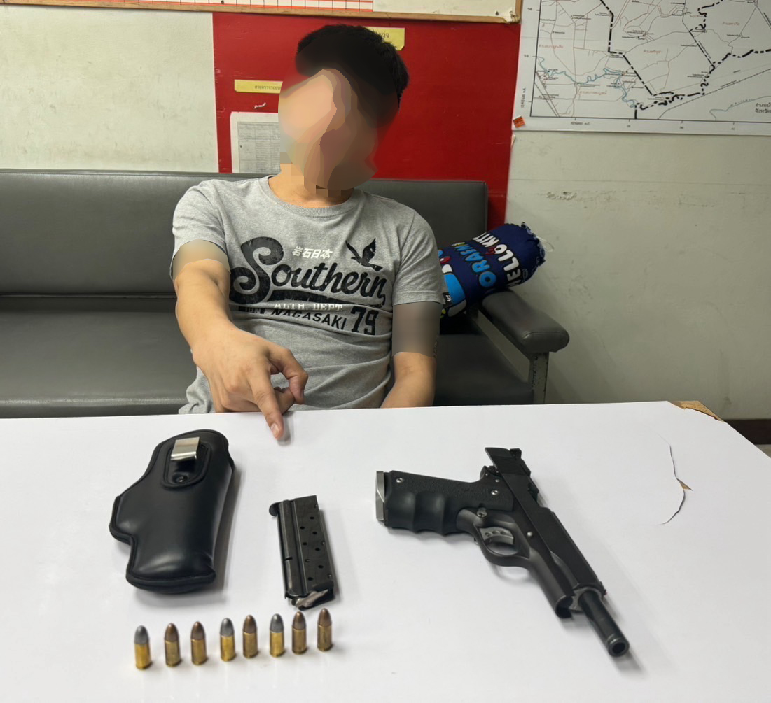วันที่ 28 มีนาคม 2567 เวลาประมาณ 02.30 น. ร.ต.อ.ศุภชัย ชื่นวิโรจน์ ร้อยเวรป้องกันปราบปราม พร้อมกำลังสายตรวจชุดที่ 2 ร่วมกันจับกุมผู้ต้องหา ครอบครองอาวุธปืนและเครื่องกระสุนปืนโดยเจ้าพนักงานไม่สามารถออกทะเบียนได้, พกพาอาวุธปืนและเครื่องกระสุนปืนไปในเมืองหมู่บ้าน หรือทางสาธารณะโดยมิได้รับอนุญาตฯ ของกลาง 1. อาวุธปืนสั้นกึ่งอัตโนมัติ(แม็กกาซีน) ขนาด 9 มม. จำนวน 1 กระบอก 2. แม็กกาซีน จำนวน 1 แม็ก 3. เครื่องกระสุนปืนขนาด 9 มม. จำนวน 8 นัด 4. ซองปืนพกในหนังสีดำ