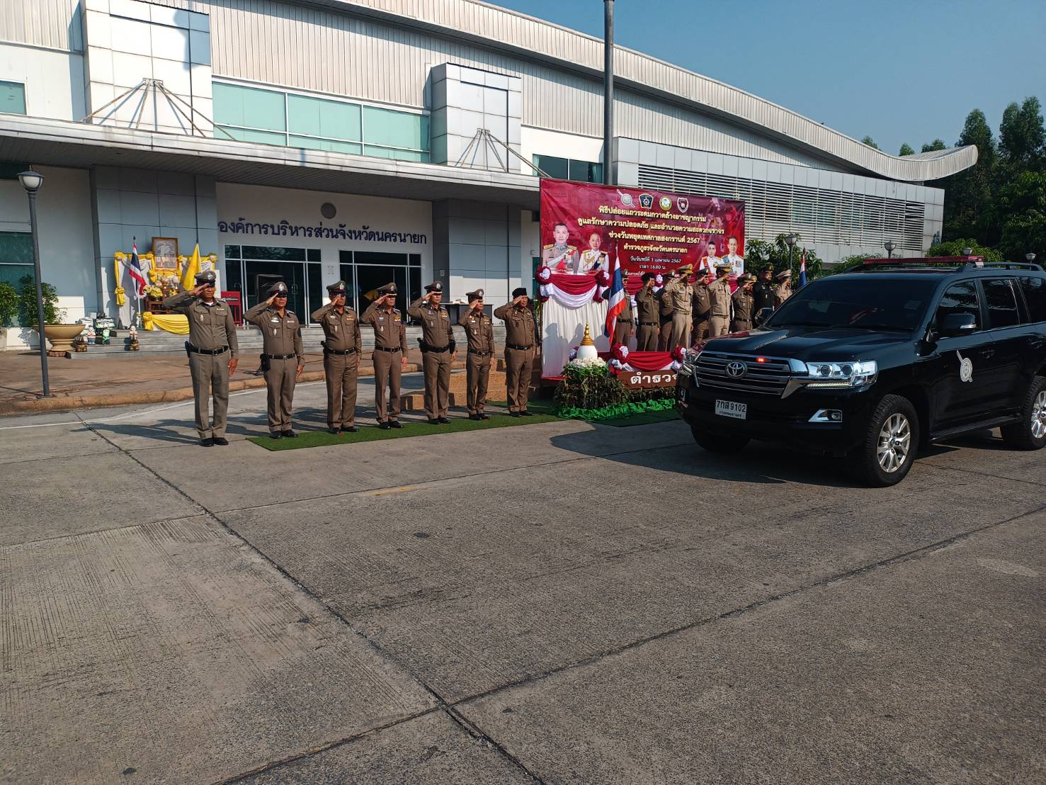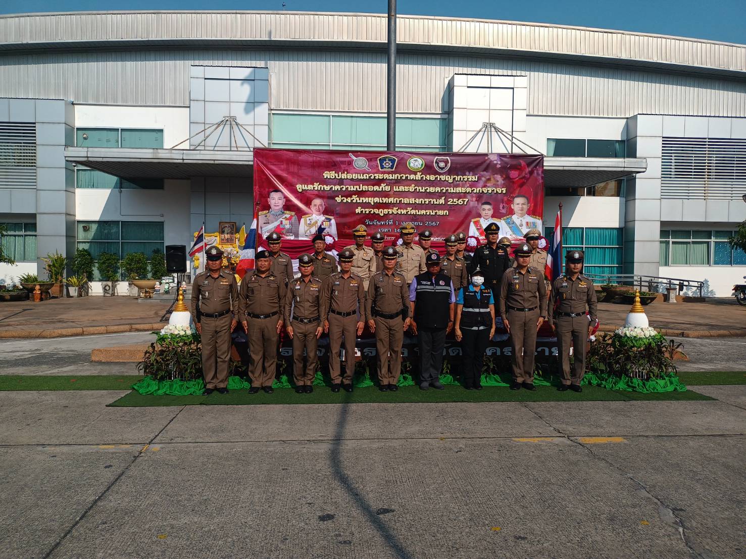 วันที่ 1 เมษายน 2567 เวลา 16.00 น. พ.ต.อ.สง่า ทางธรร ผกก.สภ.เมืองนครนายก พร้อมกำลังข้าราชการตำรวจ ร่วมพิธีปล่อยแถวระดมกวาดล้างอาชญากรรมดูแลรักษาความปลอดภัยของประชาชนและอำนวยความสะดวกการจราจร ให้แก่นักท่องเที่ยวและประชาชนในพื้นที่ ช่วงเทศกาลสงกรานต์ ณ ลานหน้า อบจ.นครนายก อ.เมือง จ.นครนายก โดยร่วมมือกันกับหน่วยงานราชการส่วนต่างๆ จังหวัดนครนายก