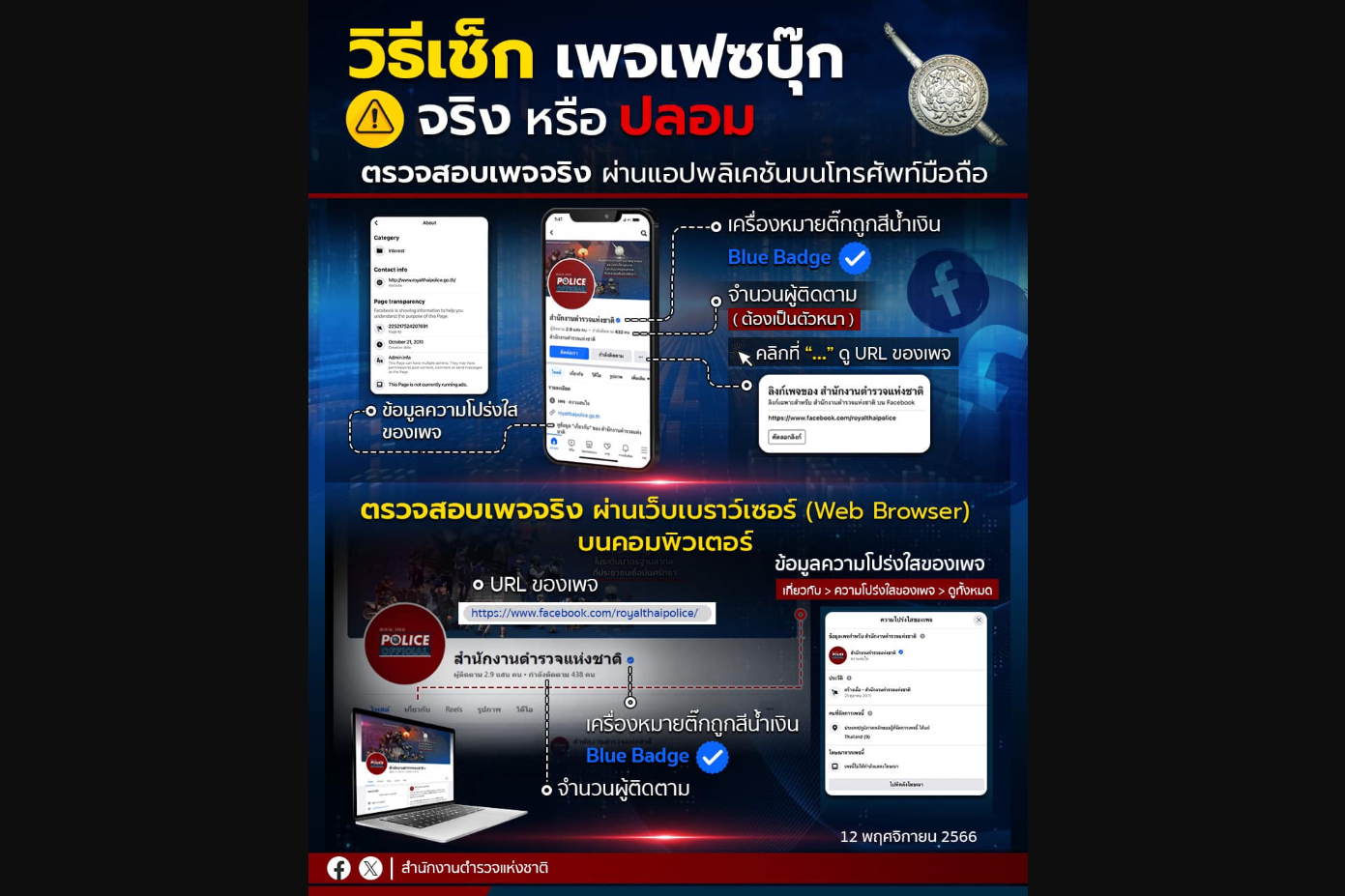 สำนักงานตำรวจแห่งชาติแนะนำเทคนิคการดูเพจเฟซบุ๊กจริง หรือ ปลอม วิธีสังเกตเพจจริง พบเพจปลอมหลอกขายของออนไลน์ สร้างยอดติดตามเกินจริง